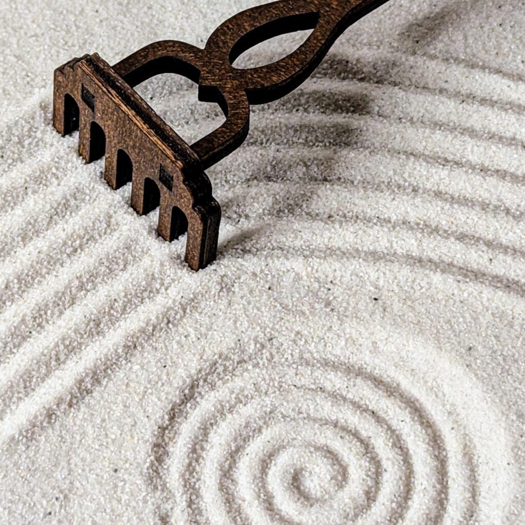 Die Miniatur-Harke erlaubt es dir, sanfte Muster im erstarrten Sand zu nachzuzeichnen und die Praxis der Achtsamkeit zu erleben. Jeder Zug der Harke lenkt deine Aufmerksamkeit auf den gegenwärtigen Moment.