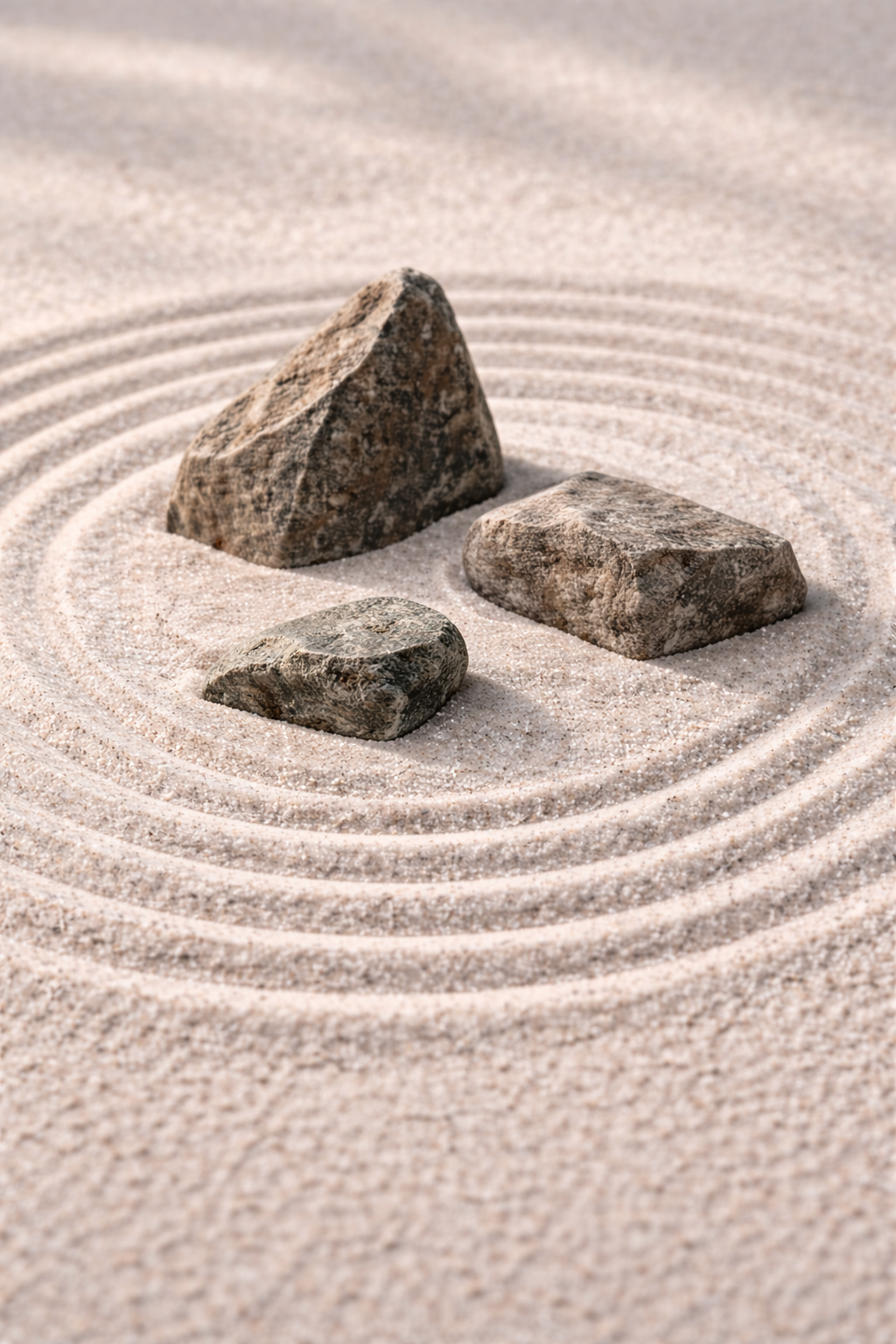 Ein Zen-Garten liegt einfach sichtbar da und macht es dir leicht, wirklich kurz abzuschalten – ohne Vorbereitung und ohne feste Routine.