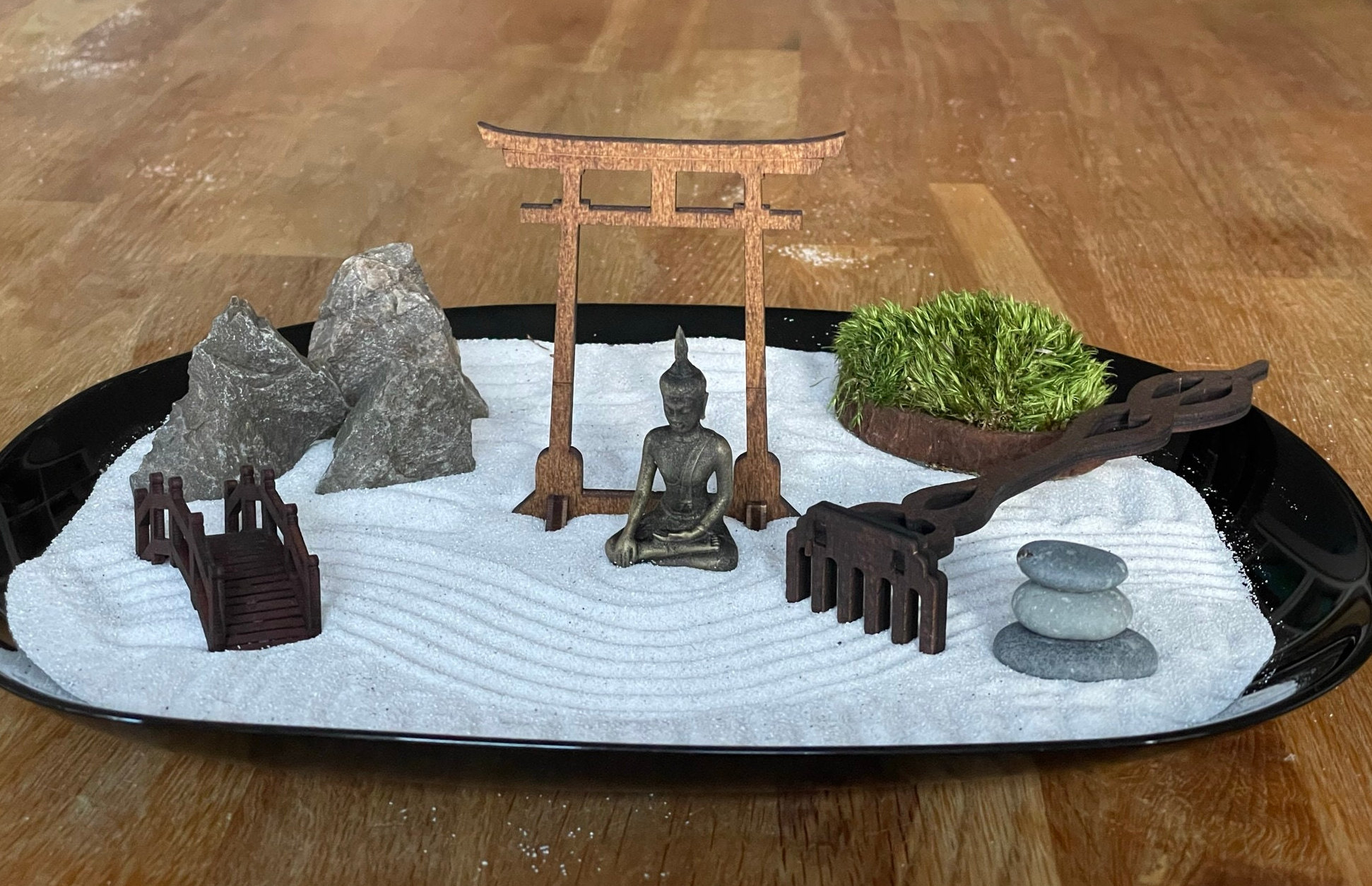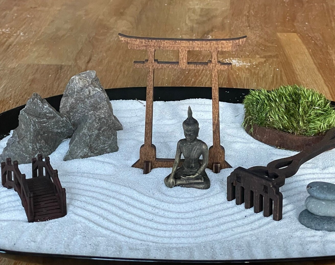 Mit der beiliegenden Holz-Harke lassen sich Linien und Kreise in den Sand ziehen. Viele nutzen den Garten für kurze bewusste Pausen, zum Abschalten nach der Arbeit oder als ruhige Abendroutine.