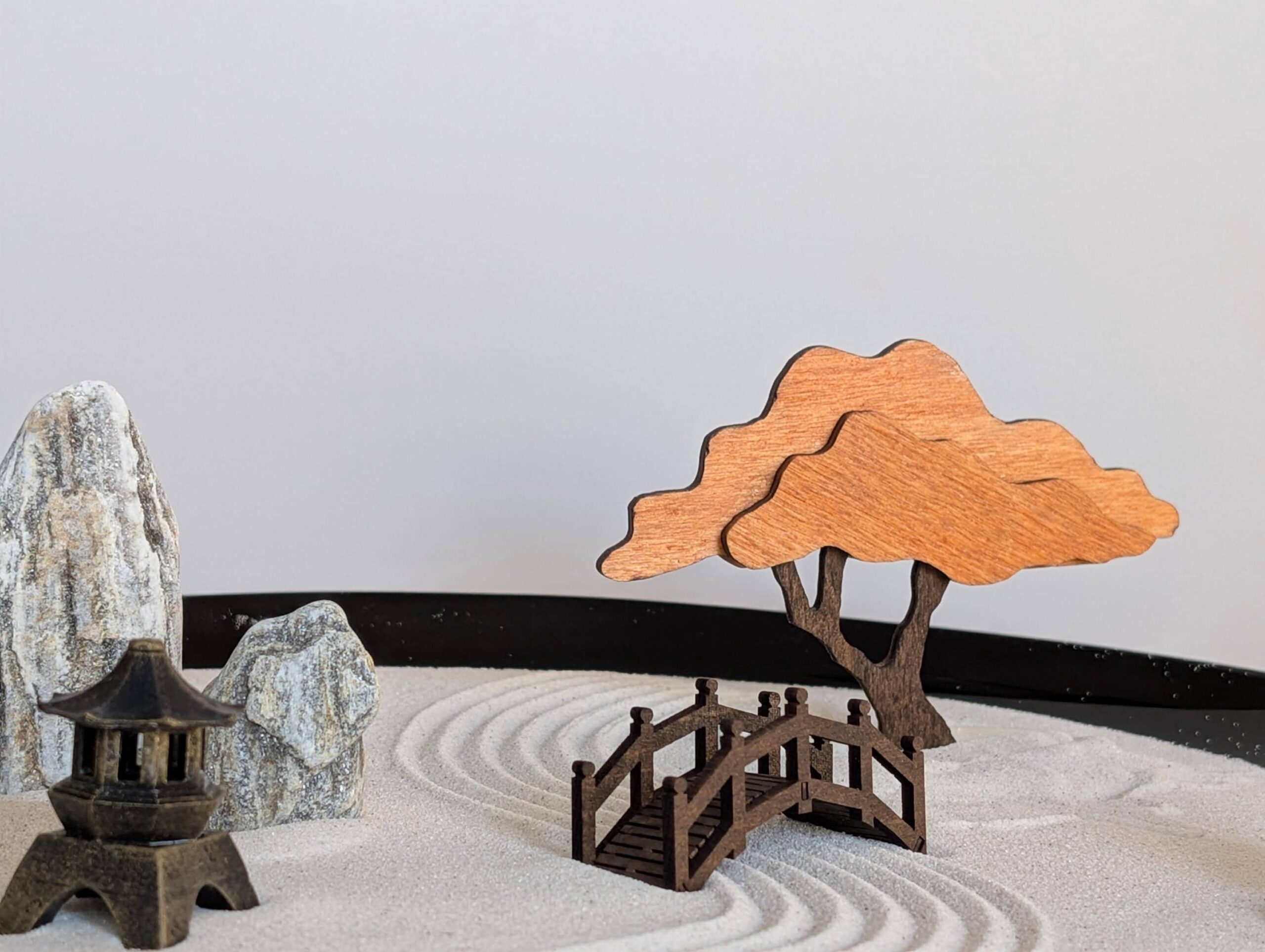 Zen-Garten aus Opalglas mit Bonsai, Brücke & Laterne – handgefertigtes Set