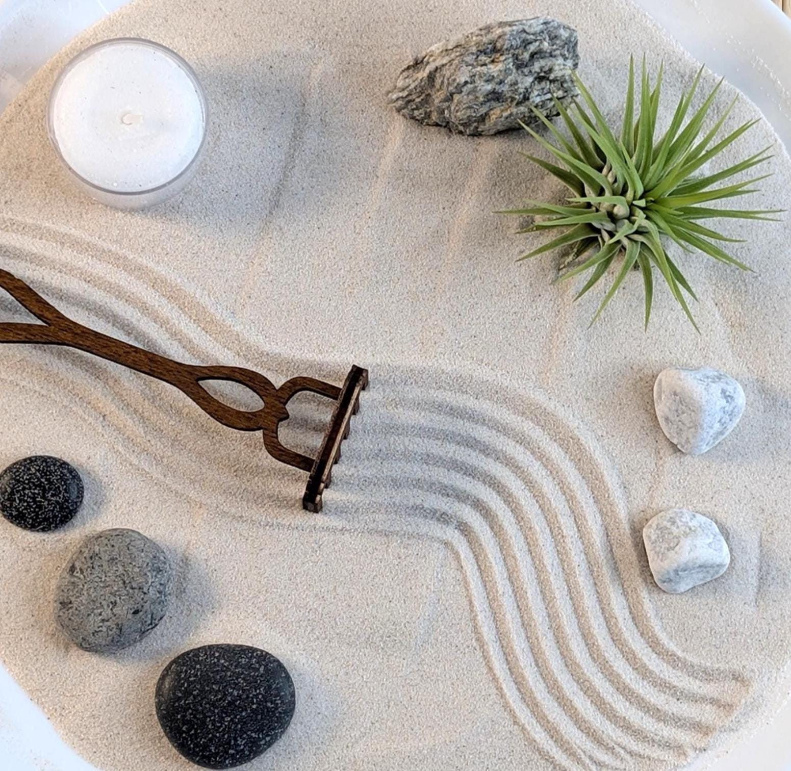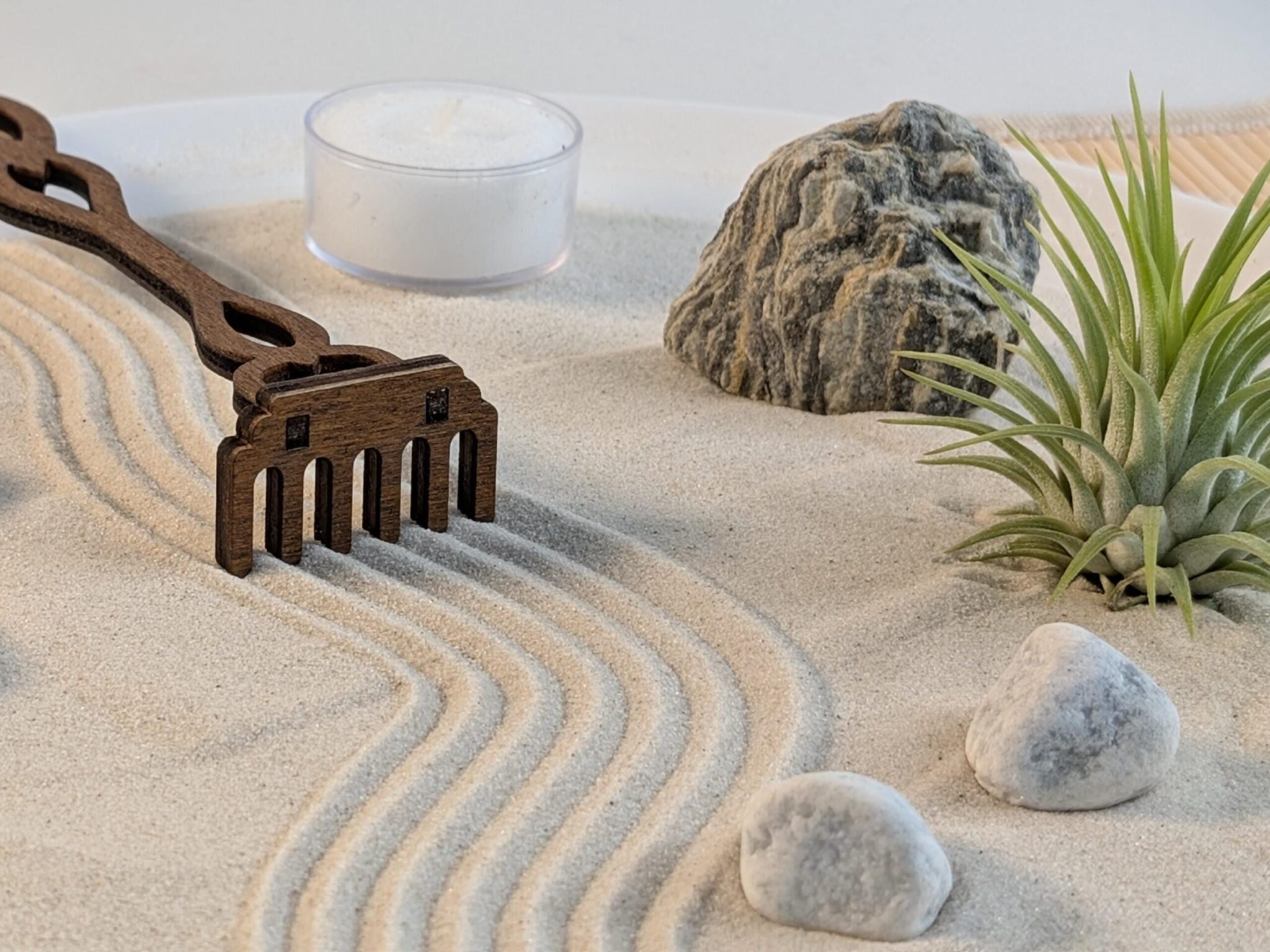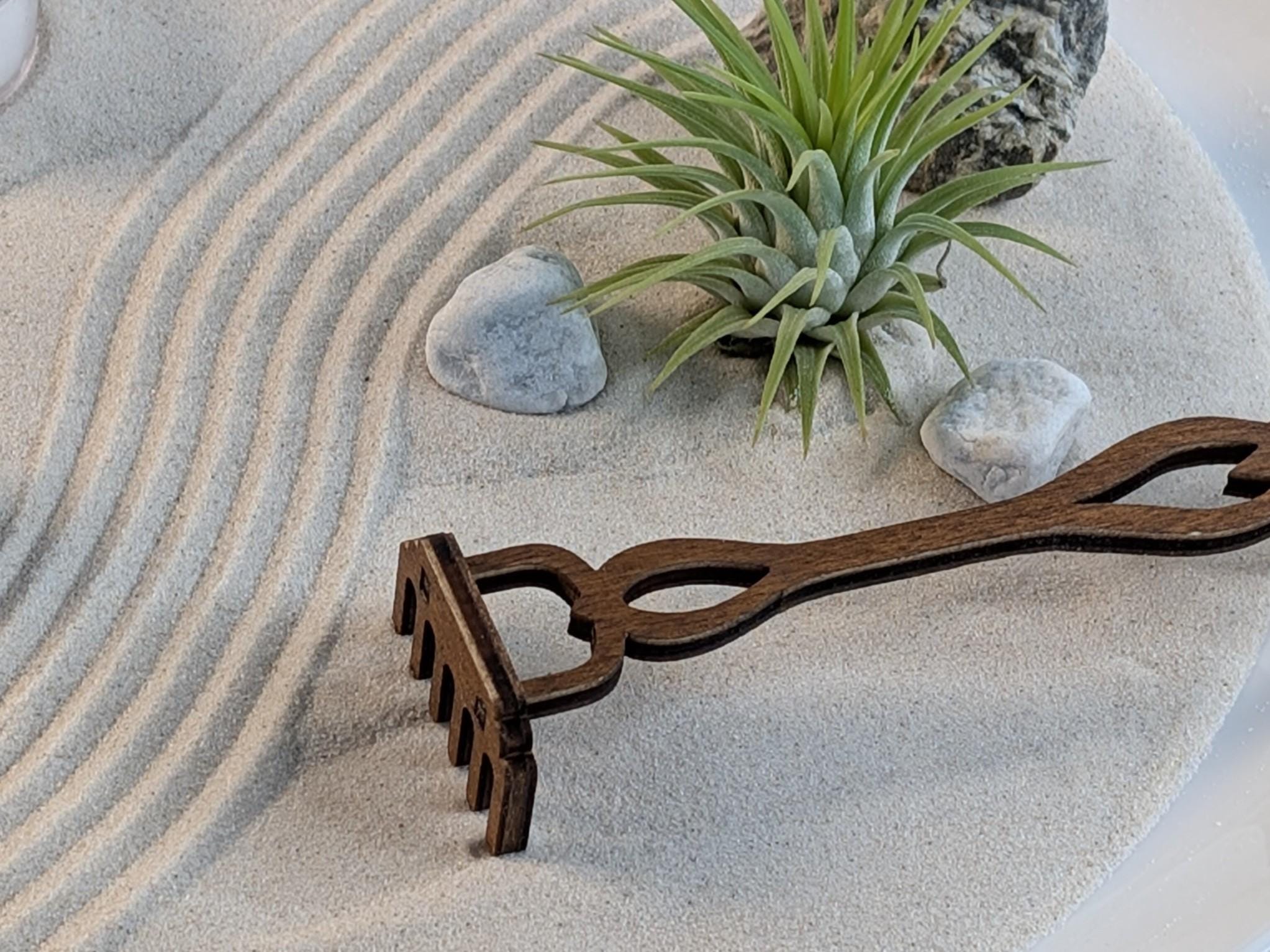 Im feinen hellen Sand kannst du mit der Holz-Harke immer wieder neue Linien und Muster ziehen. Die ruhigen Handbewegungen helfen vielen Menschen, nach einem langen Tag abzuschalten oder sich zwischendurch kurz zu sammeln.