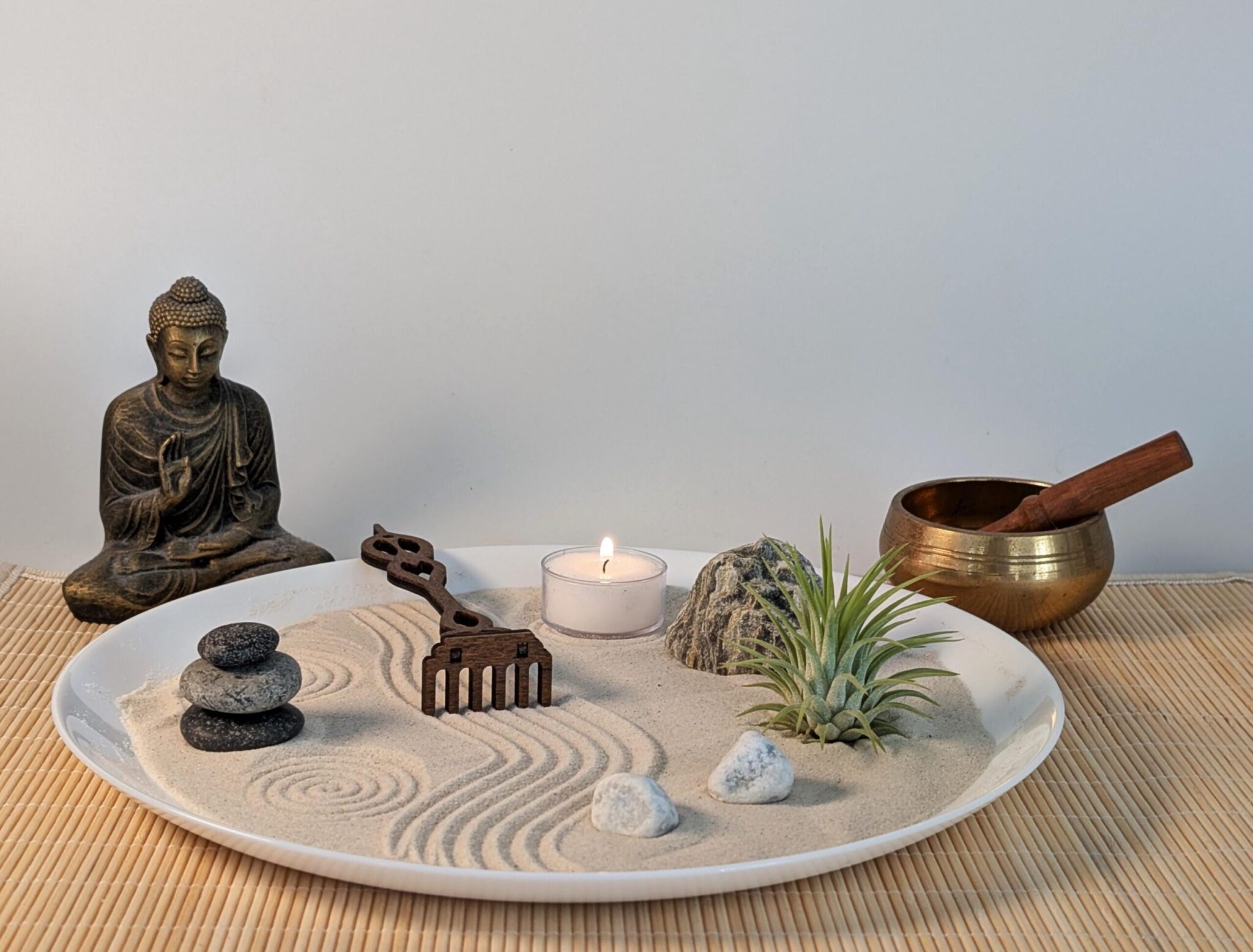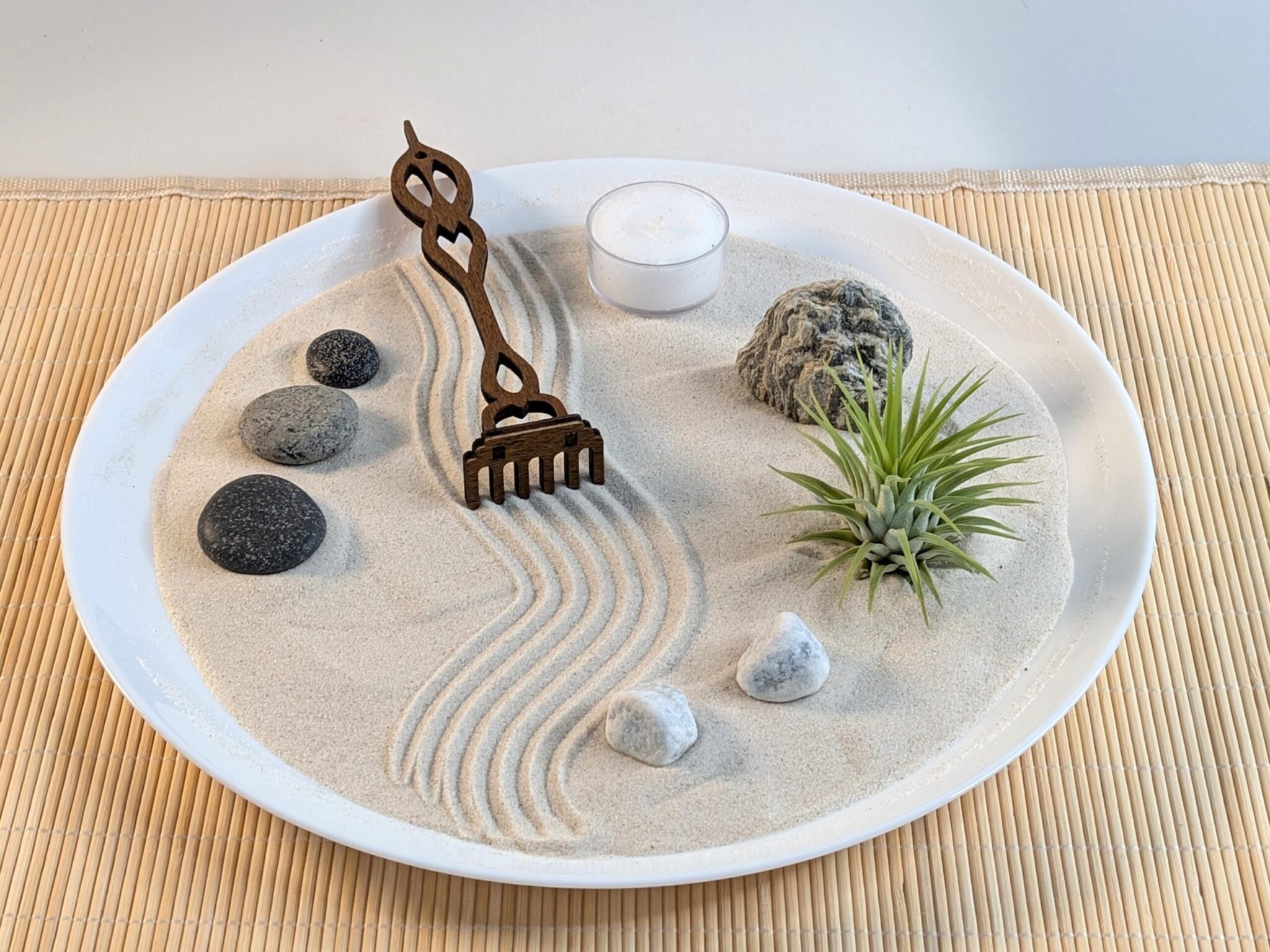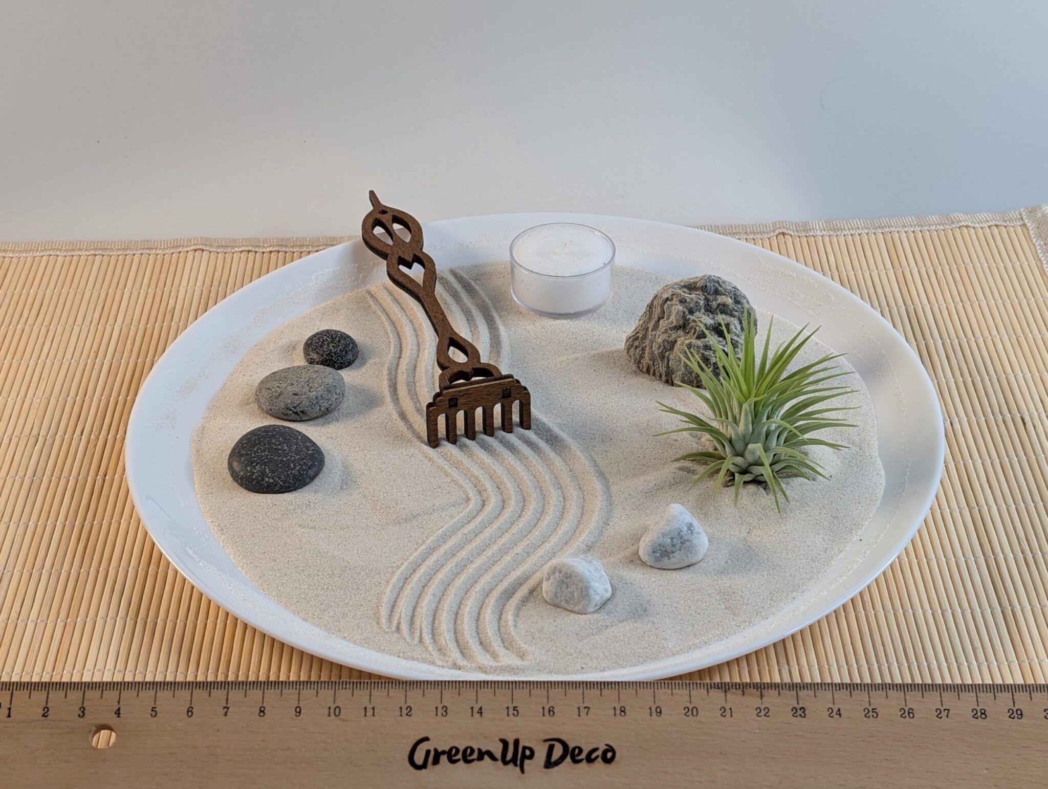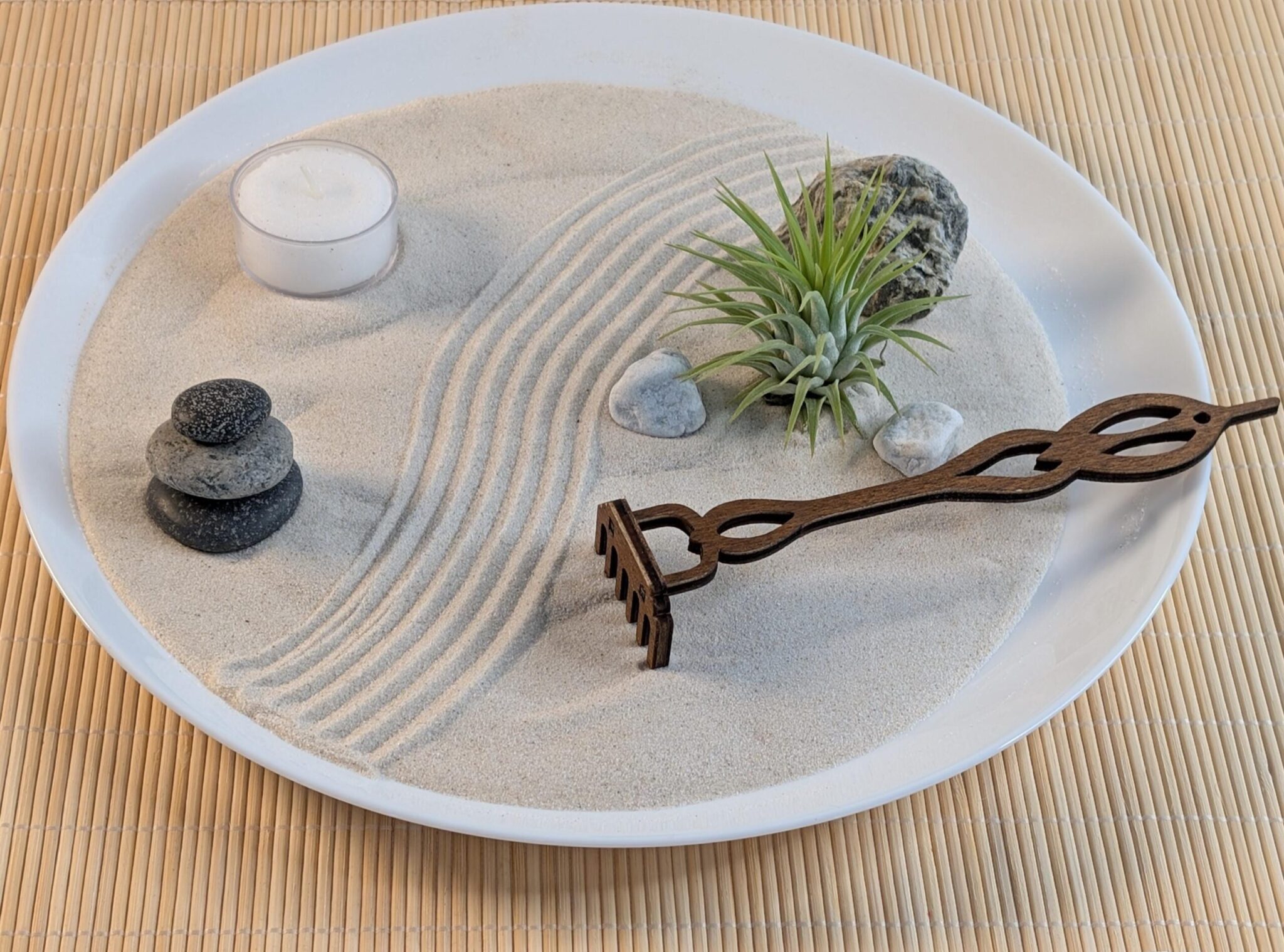 Im feinen hellen Sand kannst du mit der Holz-Harke immer wieder neue Linien und Muster ziehen. Die ruhigen Handbewegungen helfen vielen Menschen, nach einem langen Tag abzuschalten oder sich zwischendurch kurz zu sammeln.
