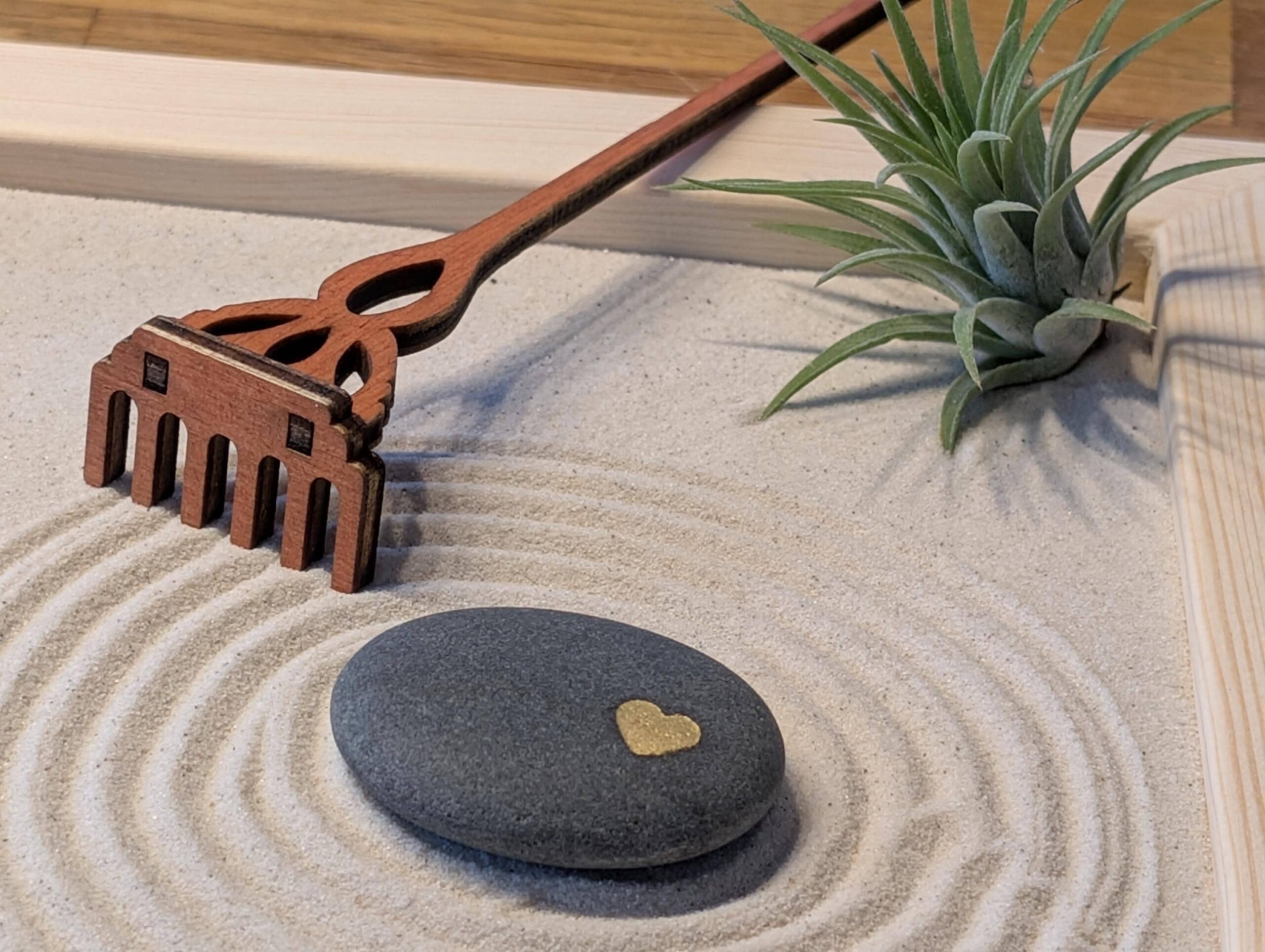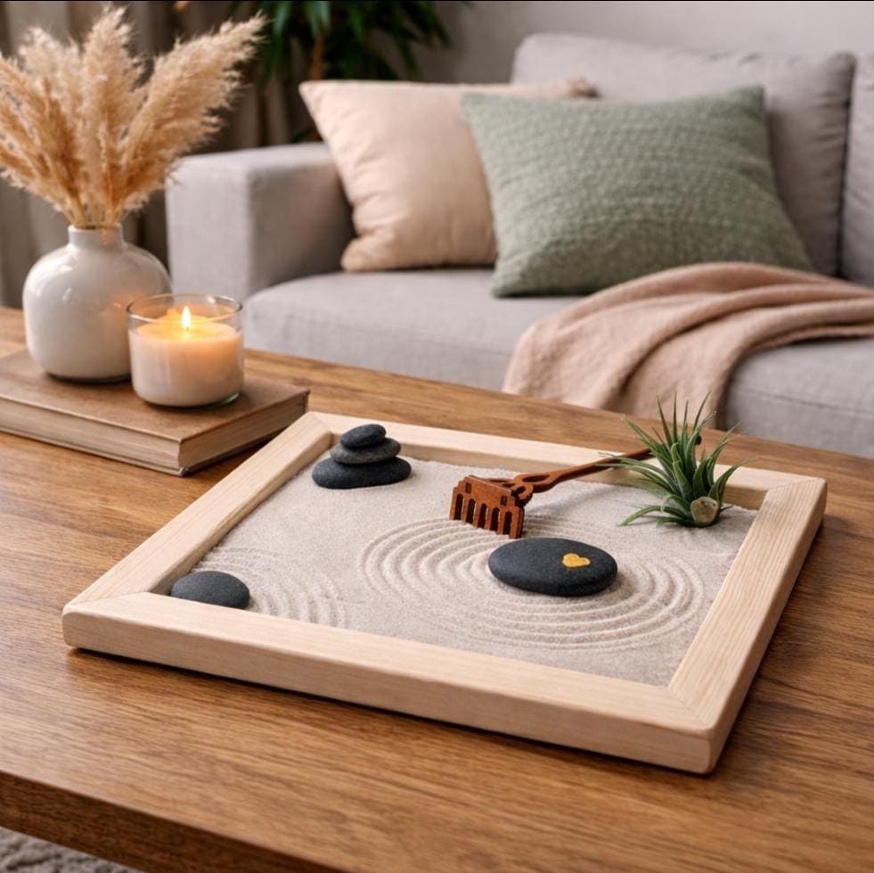 Mit der beiliegenden Holz-Harke ziehst du gleichmäßige Linien in den feinen Sand. Die ruhige Bewegung hilft, Gedanken zu ordnen und für einen Moment Abstand vom Alltag zu gewinnen.