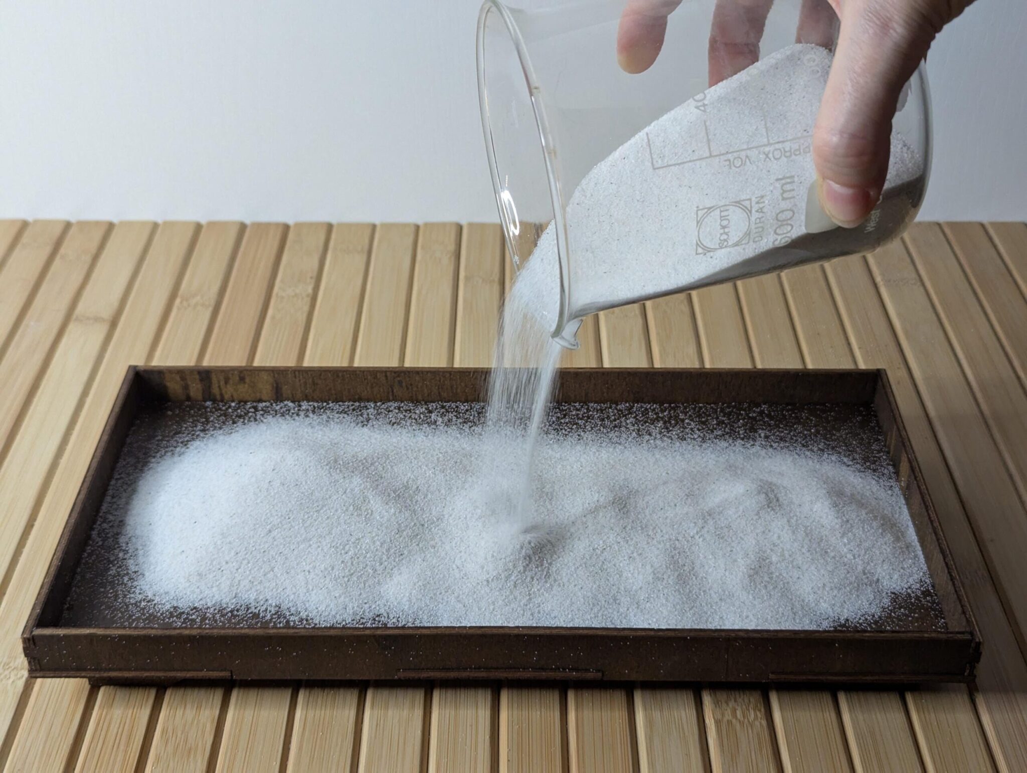 Der Sand wird mehrfach gewaschen, gesiebt und entstaubt. Dadurch rieselt er gleichmäßig, staubt kaum und bleibt angenehm zu bearbeiten.
