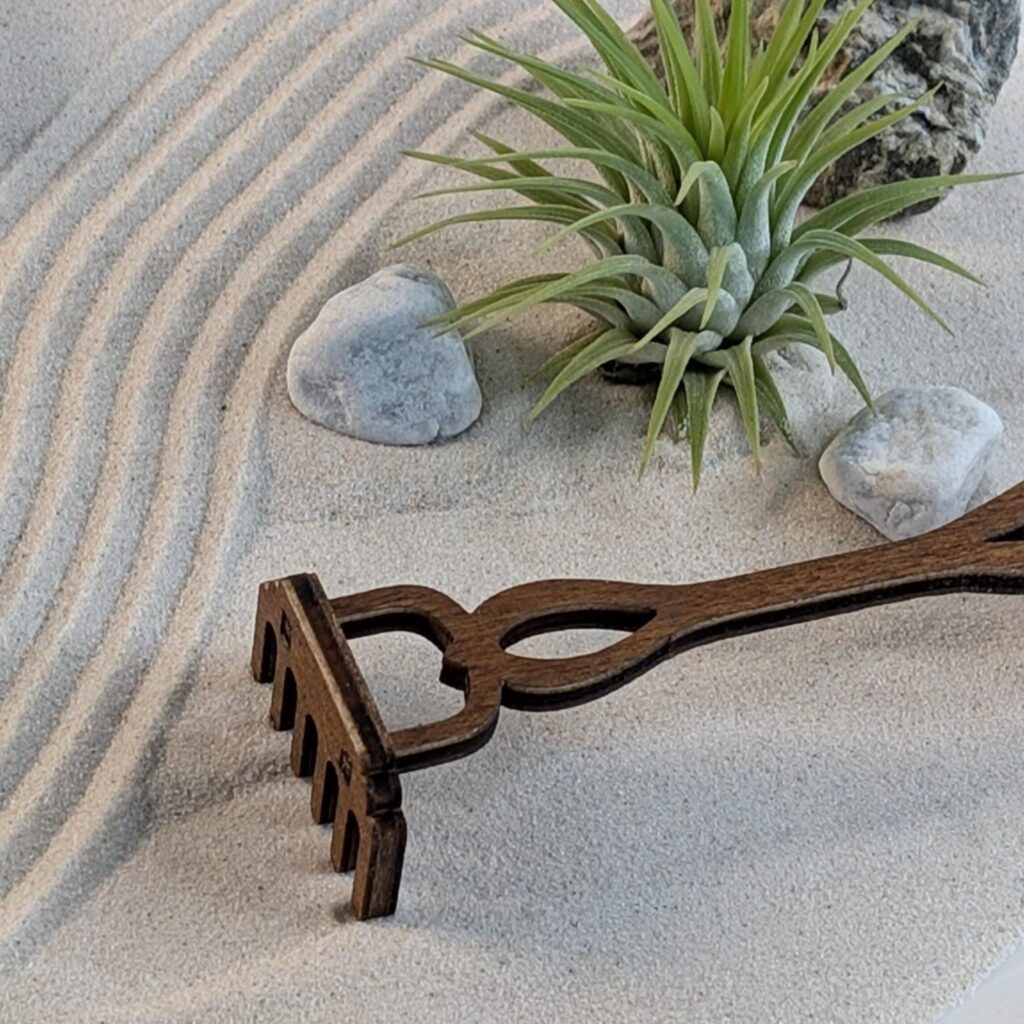 - Muster harken: Mit einem kleinen Rechen (im Japanischen Samon) ziehe beruhigende Wellen- oder Kreislinien in den Sand – das Kernstück der meditativen Praxis.